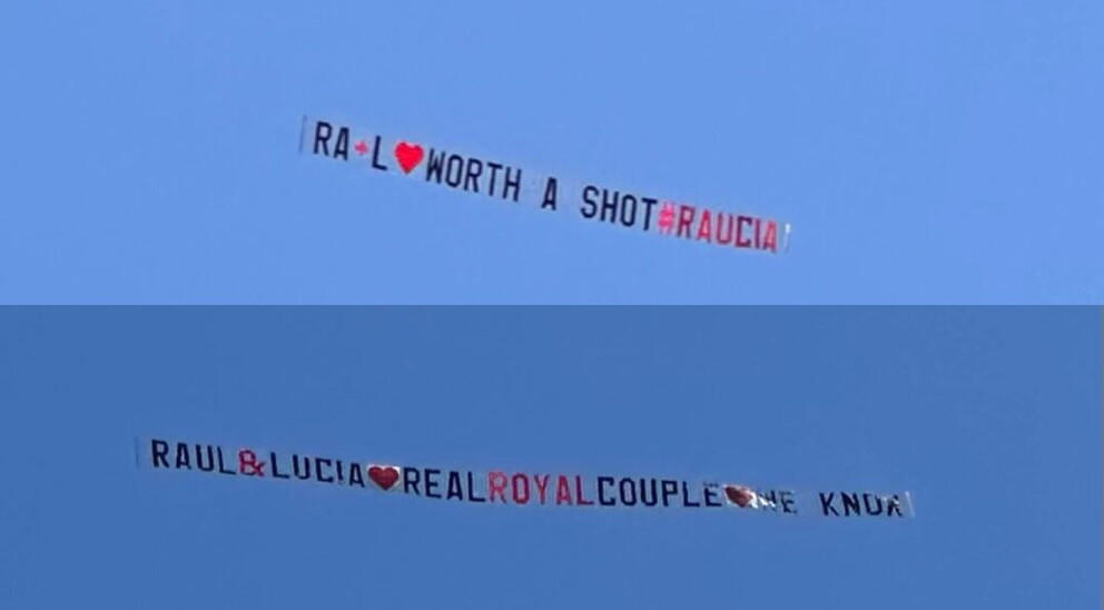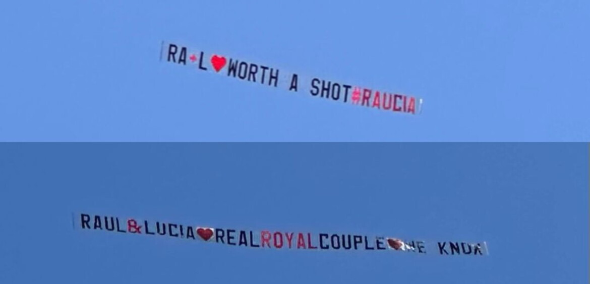 Un altro aereo ha sorvolato il giardino portando un nuovo messaggio dedicato a Lucia e Raul.